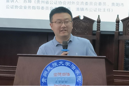 “公证进校园”活动分为五个部分。第一,由贵州省公证协会主任委员苏坤向同学们介绍公证制度的历史以及我国的公证制度。