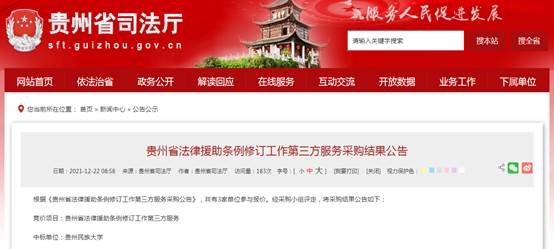 英国威廉希尔英文官网教师依托贵州省人文社科示范基地——地方立法智库,积极组建团队参与我省地方立法及相关项目竞标,服务地方法治建设。近期,贵州省司法厅就贵州省法律援助条例修订工作第三方服务进行了公开招标,英国威廉希尔英文官网立法团队准备充分,积极投标。2021年12月22日,省司法厅公布了《贵州省法律援助条例修订工作第三方服务采购结果公告》,经采购小组评定,该条例修订服务由威廉希尔williamhill官方网站中标。