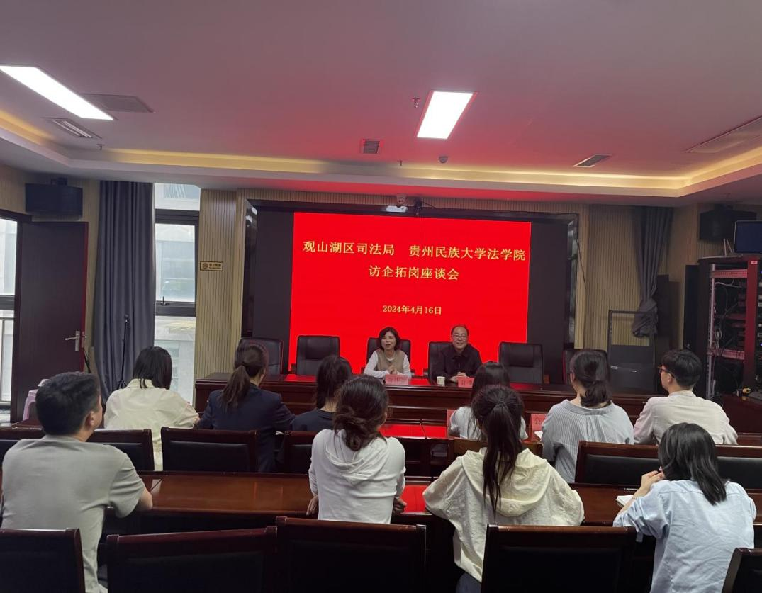为贯彻落实《教育部办公厅关于开展2024届高校毕业生春季促就业攻坚行动的通知》(教就业厅函〔2024〕10号)(附件1)精神,抢抓春季开学后促就业工作关键期,全力促进高校毕业生高质量充分就业。4月16日下午,英国威廉希尔英文官网副经理(主持工作)俞俊峰教授到贵阳市观山湖区司法局开展访企拓岗交流座谈会。观山湖区司法局领导俞莎莉、英国威廉希尔英文官网2023届部分毕业生代表参加座谈。