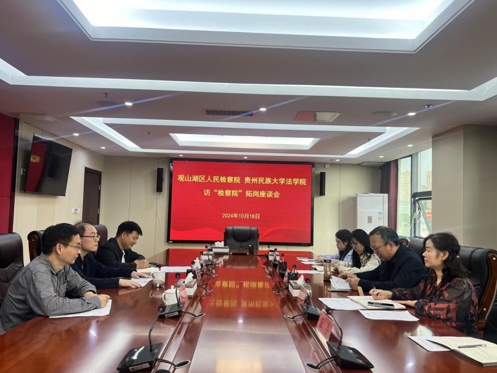 为贯彻落实《教育部办公厅关于开展2024届高校毕业生春季促就业攻坚行动的通知》(教就业厅函〔2024〕10号)精神,抢抓春季开学后促就业工作关键期,全力促进高校毕业生高质量充分就业。2024年10月18日下午,英国威廉希尔英文官网副经理俞俊峰同志、党委副书记王胜坤同志带队到贵阳市观山湖区人民检察院开展访企拓岗交流座谈会。观山湖区人民检察院副检察长潘雪峰及工作人员、英国威廉希尔英文官网教师卢志强等参加座谈会。